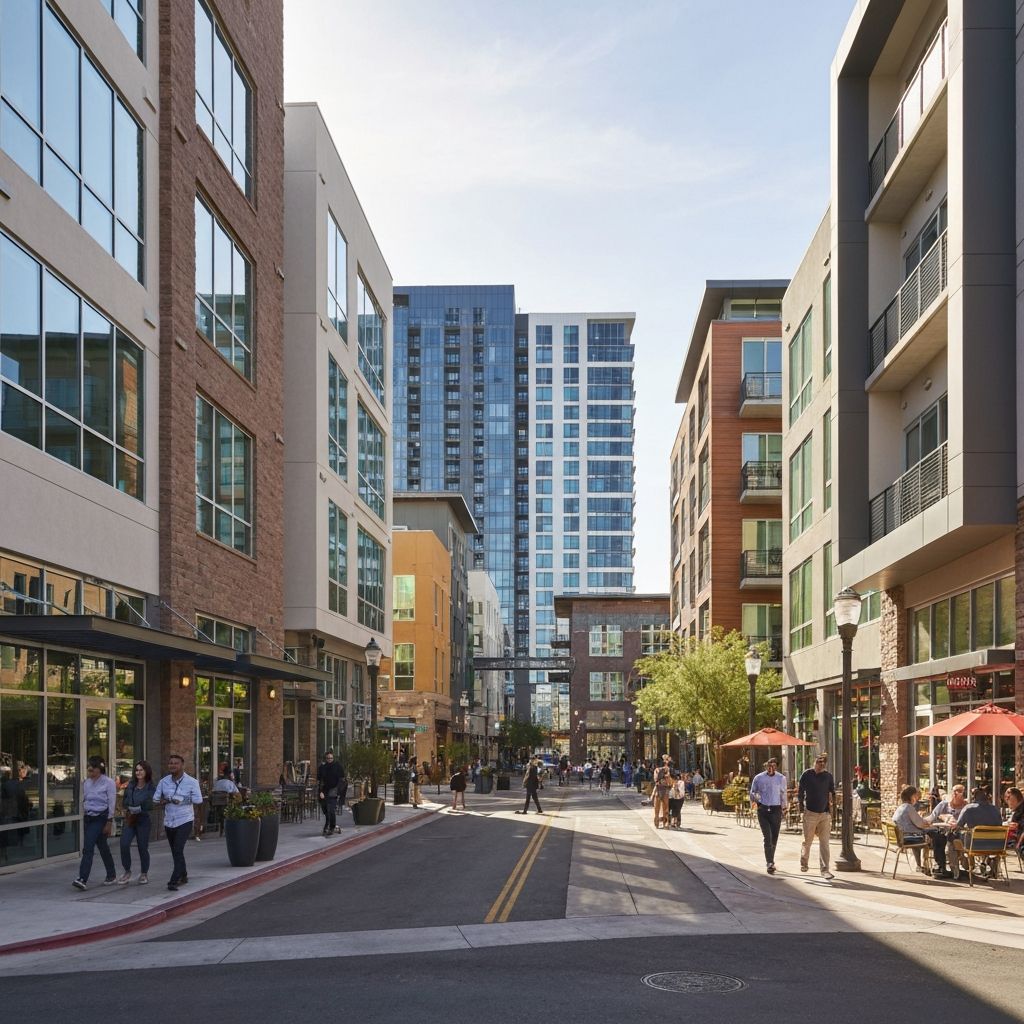 Walkable urban core with mixed-use developments, young professionals, and access to light rail. Street parking challenges.
