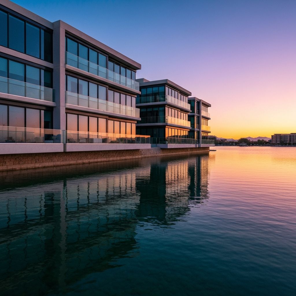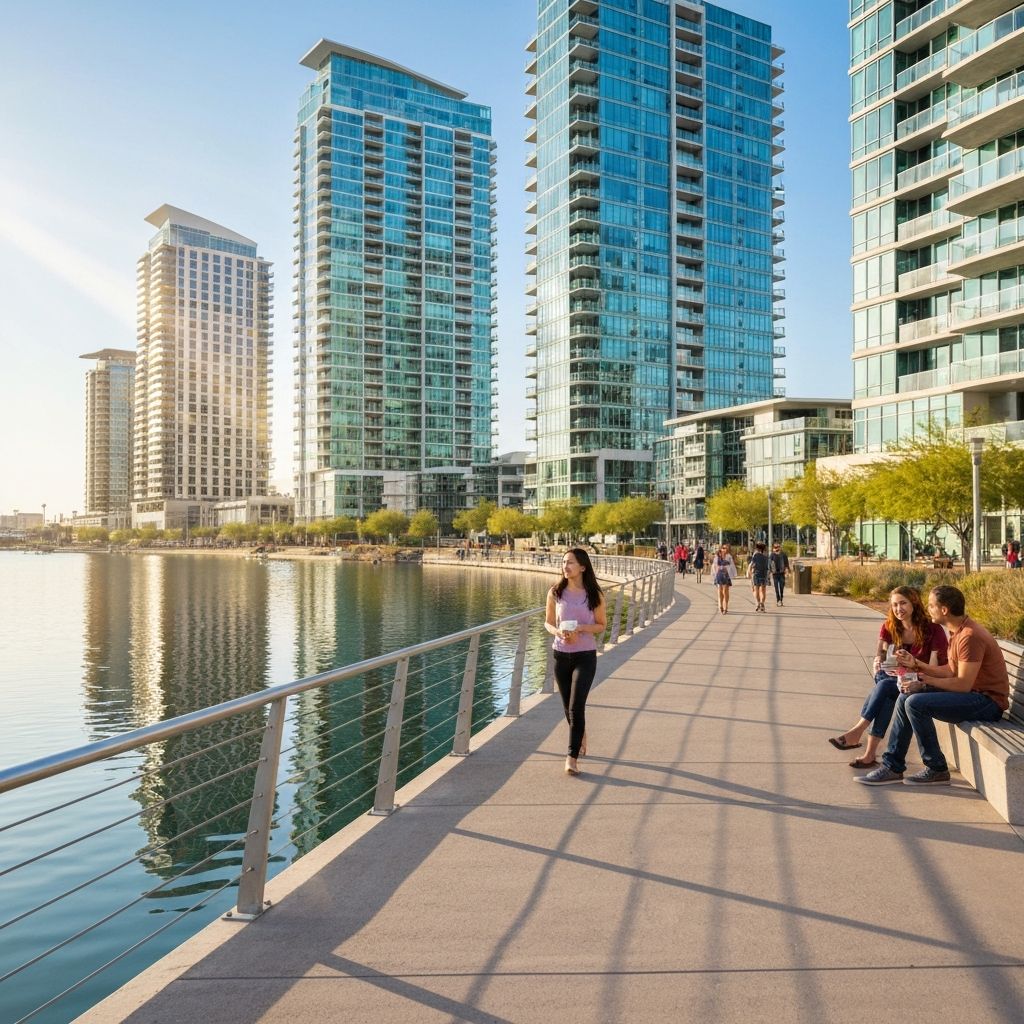 Upscale waterfront living with high-rise condos, luxury amenities, and urban lifestyle. Elevator coordination required.