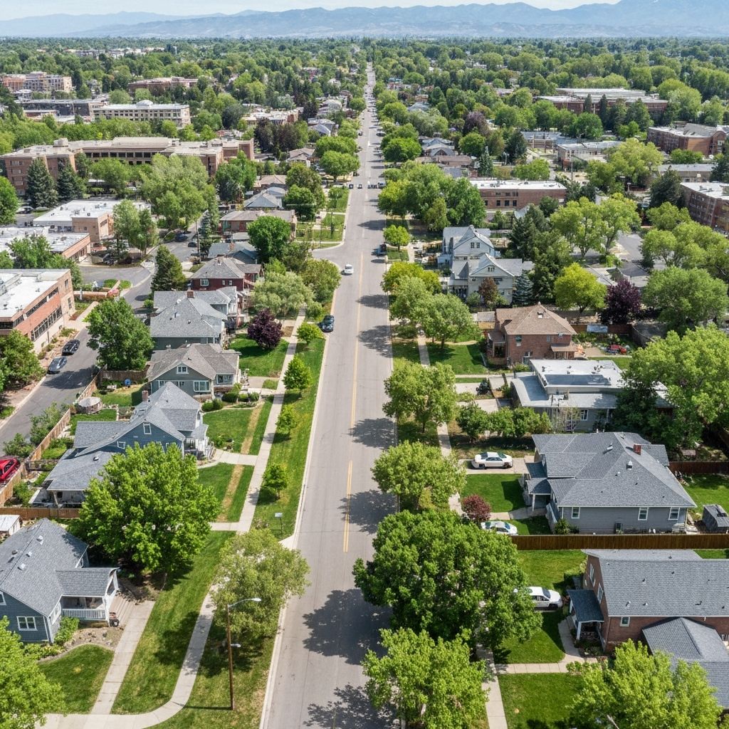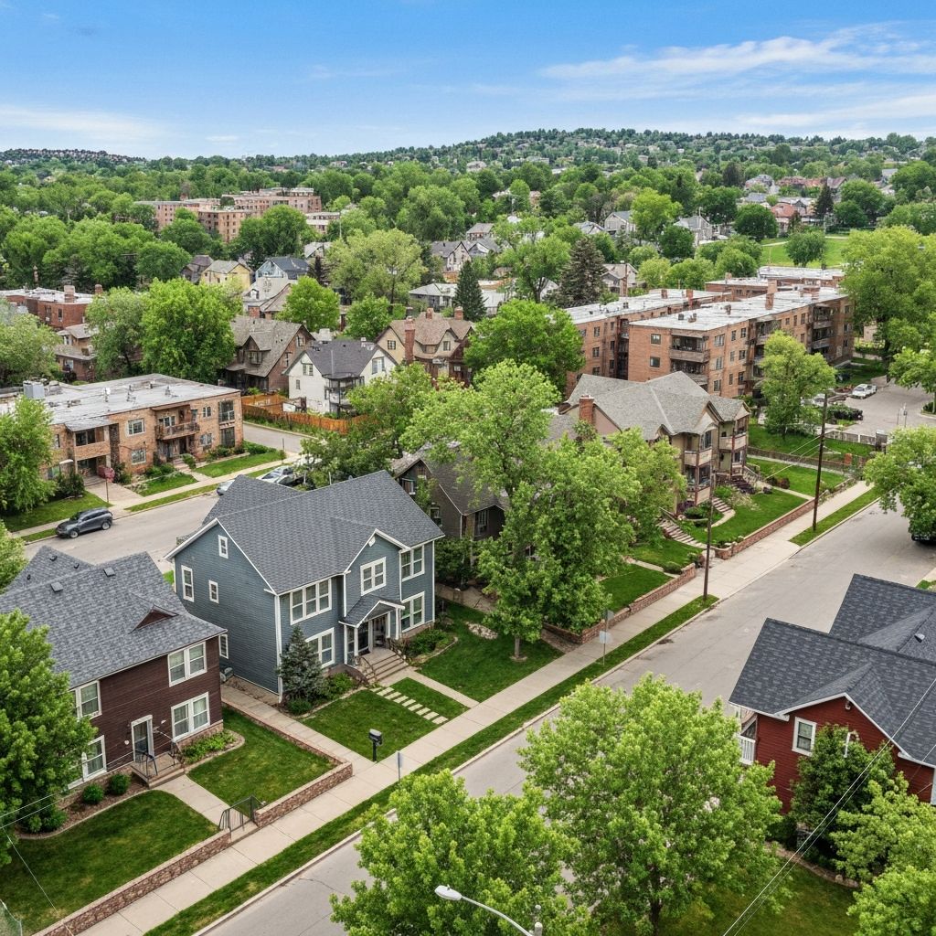 Walkable neighborhood center with bungalows and shops. Specialized moving for Denver Squares and narrow streets.