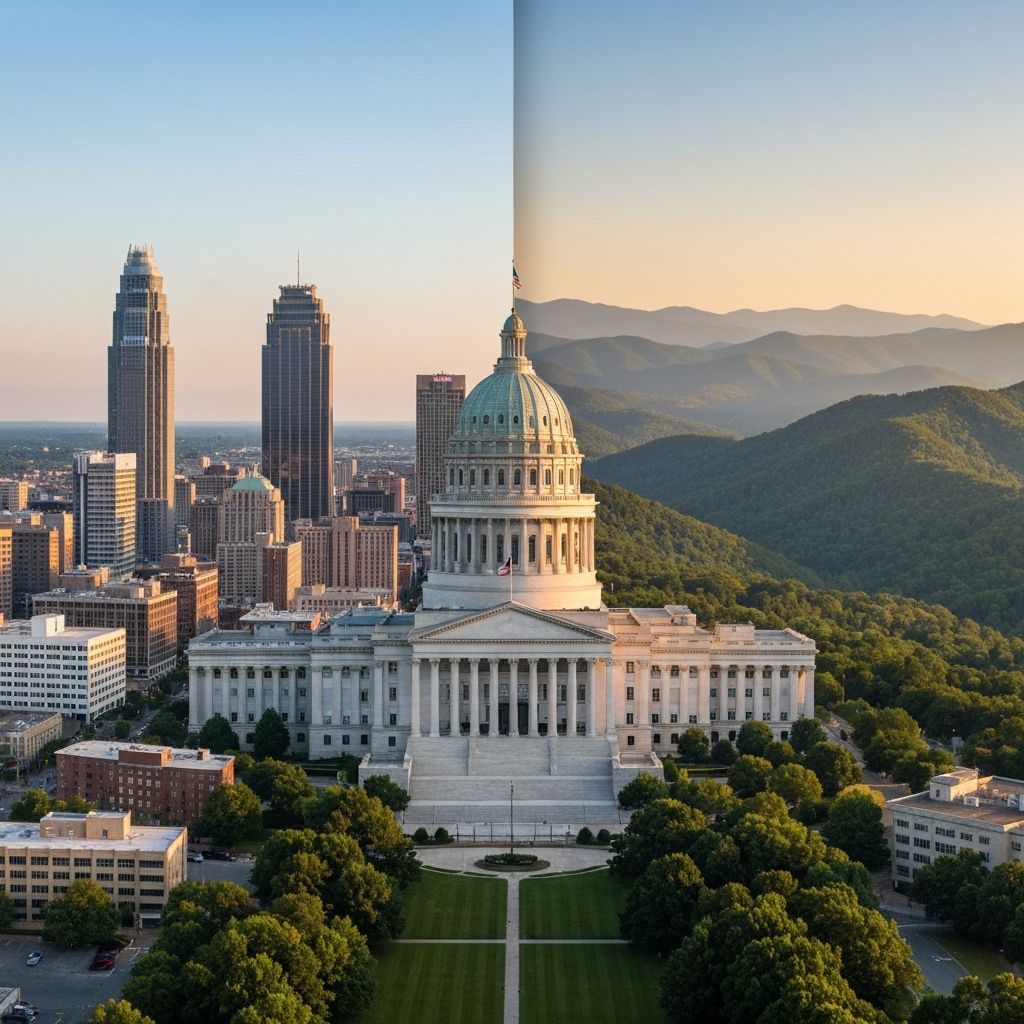 Top NC relocation destinations: Raleigh (Research Triangle tech hub, #1 livability rankings), Charlotte (finance, banking, fastest-growing large city), Cary (family-friendly, top schools), Asheville (mountain arts lifestyle), Durham (Duke University, medical research), and Wilmington (coastal living, growing economy). NC has net in-migration of 100,000+ people per year.
