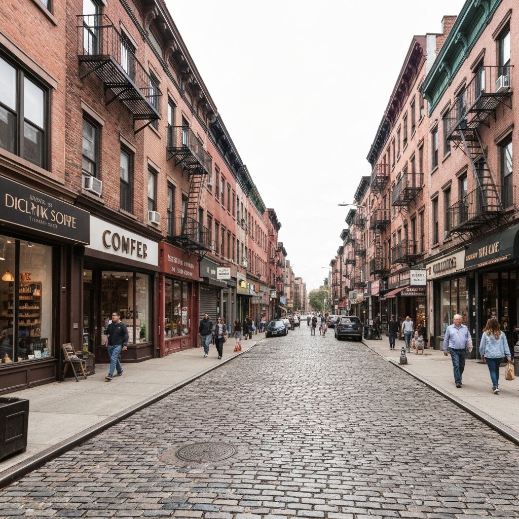 Bustling commercial corridor with independent shops, cafes, and brownstone residences above