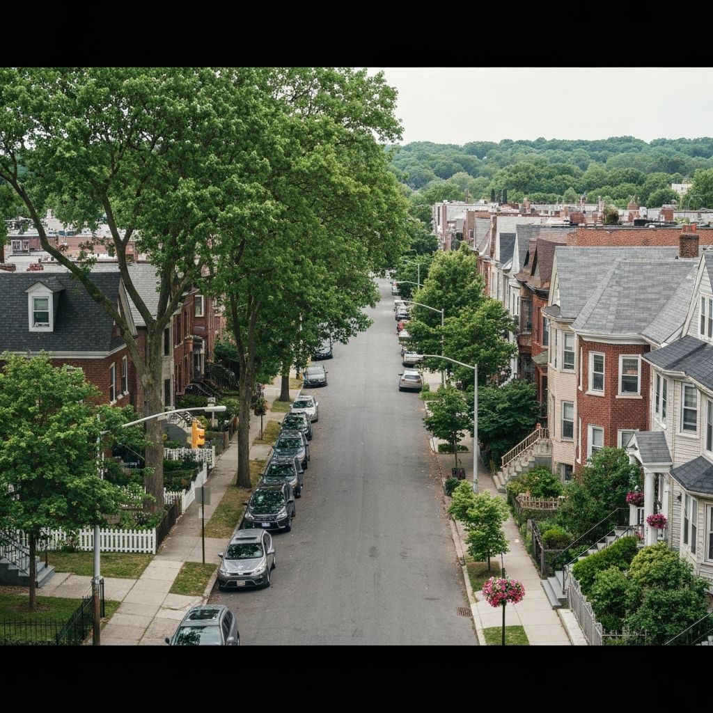 Quiet residential neighborhood bordering Prospect Park with single-family homes and apartments