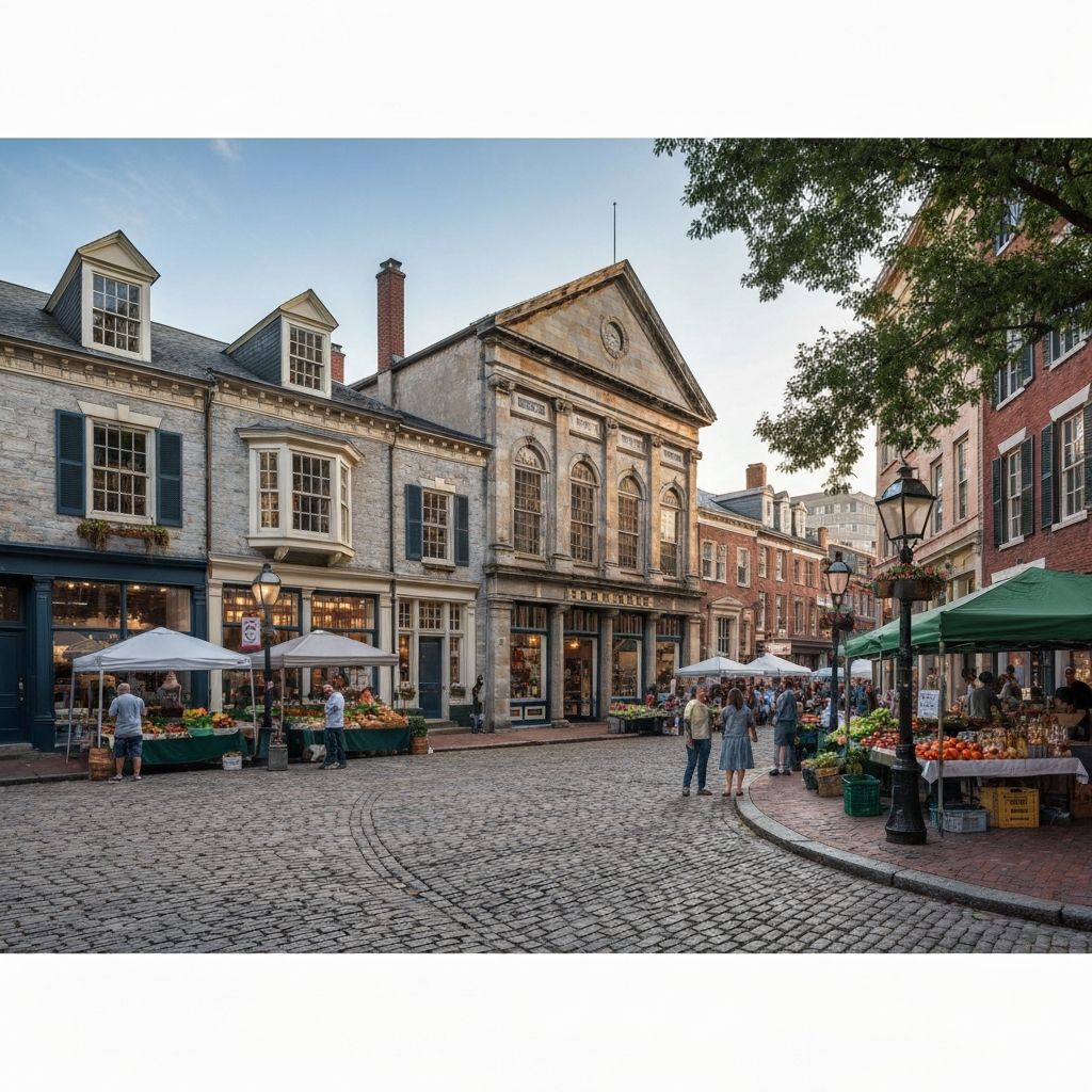 Colonial townhouses near 2nd Street historic market with cobblestone streets and farmer's market logistics.