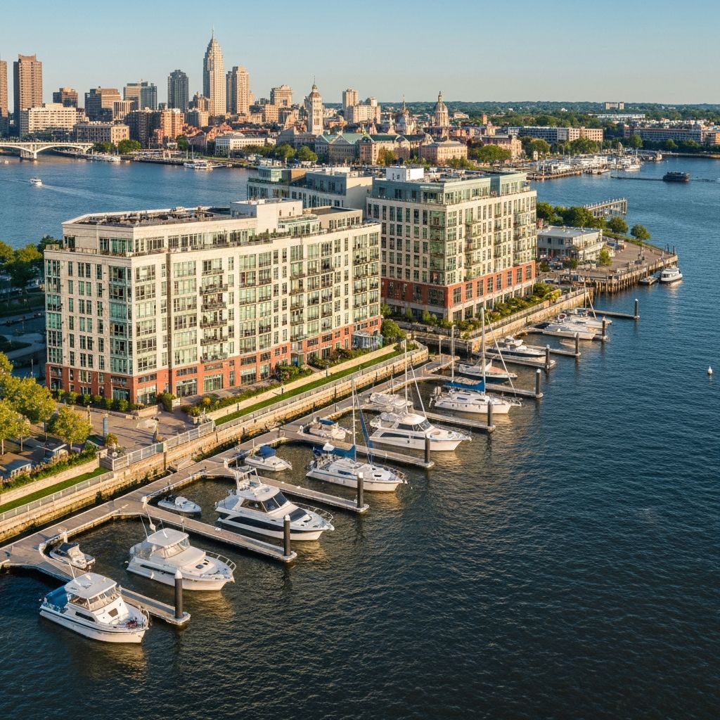 Delaware River waterfront apartments and condos with marina access and I-95 corridor proximity.