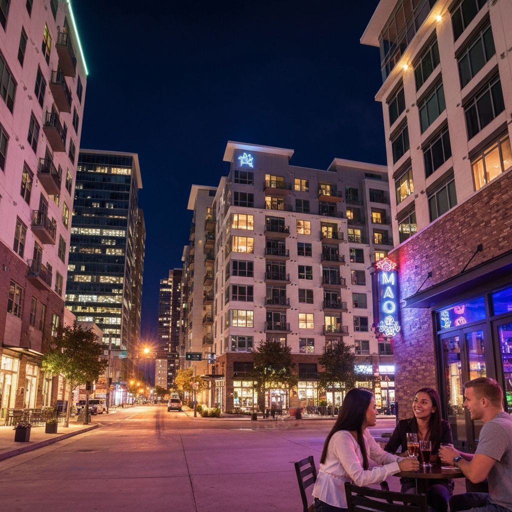 Modern apartments and nightlife. Young professional moving for Midtown's vibrant urban scene.